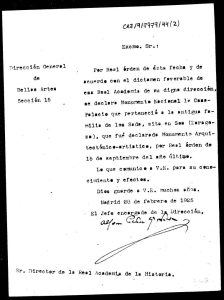La burocracia no comprendió la urgencia. La Junta Superior de Excavaciones y Antigüedades, entendiendo que la declaración de M. H. N. correspondía a las Reales Academias de Bellas Artes de San Fernando y de la Historia, propuso que el palacio fuese declarado Monumento Arquitectónico-artístico. Así se dispuso el 15 de septiembre de 1924.
