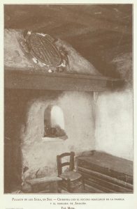 La falda de dicha chimenea lleva en relieve un escudo partido en palo el lado derecho; en la parte superior, el escudo del apellido Sada de Sos; en la inferior, las barras de Aragón, y en el lado de la izquierda, el castillo roquero igual que el que agregó a su escudo Sos cuando le agregaron la antigua villa del Real.