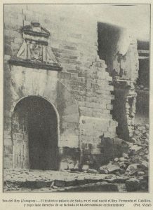 Estudiando la planta ya vemos que se trata de un edificio que ha sufrido grandes modificaciones con agregaciones sucesivas a un núcleo primitivo que corresponde a la zona del cuarto del rey. La única puerta de aquella época que queda en la fachada está situada precisamente en esta parte, y creemos que en la fotografía destacan por un tono algo más claro las piedras del siglo XV. La misma esquina derecha del edificio fue reconstruida, y de, la parte primitiva no quedaba en la fachada más que la puerta pequeña y una ventana insignificante, demostrando que el rey nació en una vivienda modesta, como seguramente lo serían todas las de Sos en aquella época en que los pueblos se formaban.