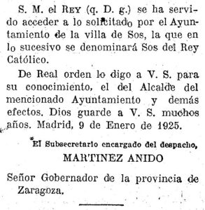 Pero qué más, sino menos, hubiera sido necesario para que en acuerdo tomado por el Ayuntamiento de Sos el 16 de marzo de 1924 se solicitara perpetuar la memoria del rey Fernando el Católico para enlazar con el nombre de la Villa el de su ilustre hijo.